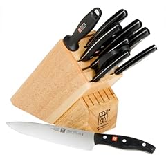 J.A. henckels Twin Signature 11pc Block Set contains the following: 2 1/2-inch Peeler, 4-inch Parer, 5-inch Serrated Utility, 6-inch Utility, 8-inch Chef's, 7-inch Hollow Edge Santoku, 8-inch Bread, 4 1/2-inch Steak, Kitchen Shears, 9-inch Steel, Hardwood Block